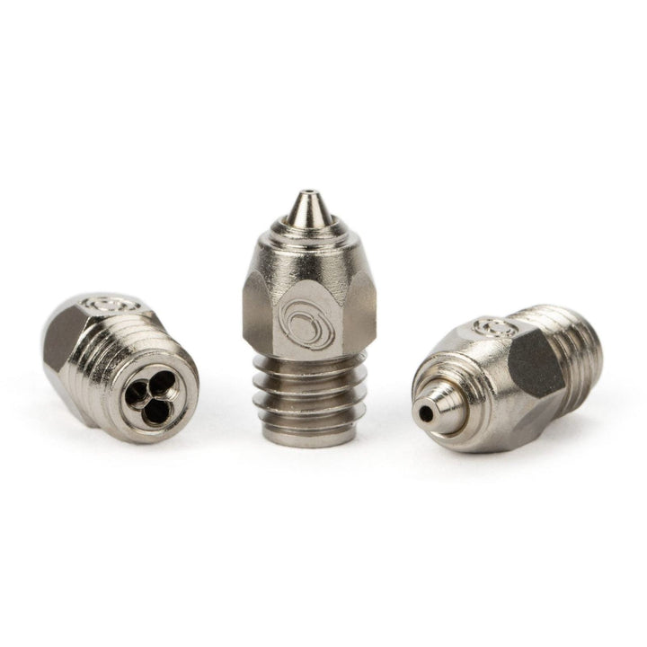 Die CHT®-Düsen teilen das Filament in drei dünne Stränge auf, wodurch es von innen heraus schneller aufschmilzt. Das ermöglicht deutlich höhere Durchflussraten und kürzere Druckzeiten. Die Nickelbeschichtung reduziert zudem das Anhaften von Filament und schützt die Oberfläche vor Korrosion.