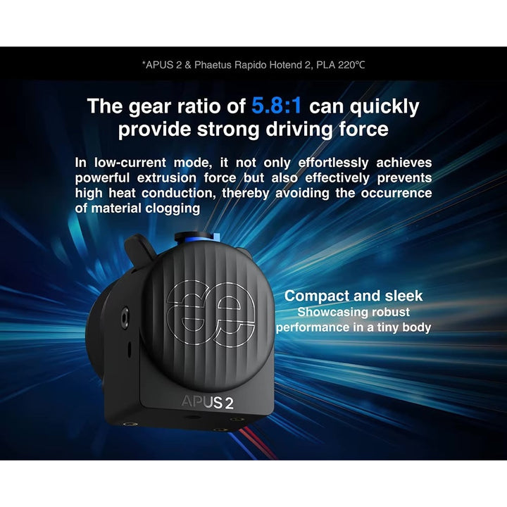 Verbessern Sie Ihr Druckerlebnis mit dem APUS 2 Extruder – eine Kombination aus modernsten Funktionen und Benutzerfreundlichkeit, die den Bedürfnissen sowohl professioneller als auch enthusiastischer Anwender gerecht wird.