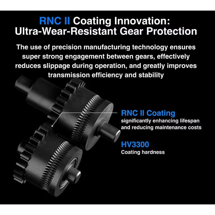 Die innovative RNC II Beschichtung bietet eine ultra-durable Schutzschicht für die Zahnräder mit einer Härte von HV3300. Dadurch wird der Verschleiß reduziert und der Wartungsaufwand minimiert. Diese präzisionsgefertigte Technologie verbessert das Zahnradengagement, minimiert das Rutschen und steigert erheblich die Effizienz sowie die betriebliche Stabilität.