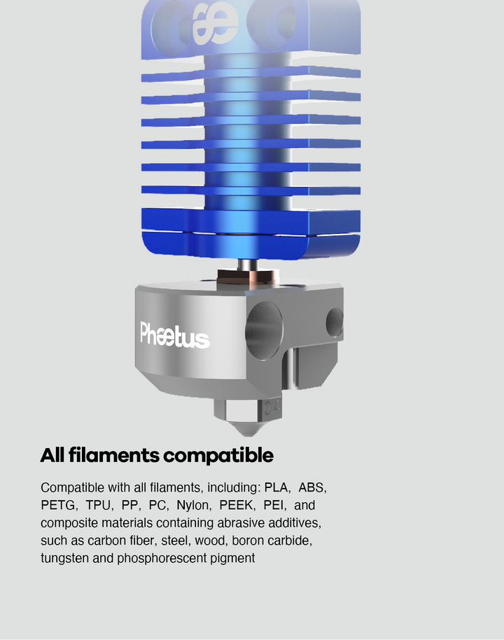 - Geeignete Materialien: Kompatibel mit allen Filamenten, einschließlich PLA, ABS, PETG, TPU, PP, PC, Nylon, PEEK, PEI und Verbundmaterialien mit abrasiven Zusätzen wie Kohlenstofffaser, Stahl, Holz, Borcarbid, Wolfram und phosphoreszierenden Pigmenten.