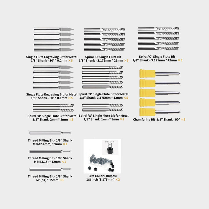 Inhoud van de levering: Freestype Specificatie Aantal Enkelvoudige gravurefrees voor metaal 1/8" schacht - 30° * 0,2mm 5 Spiraal 'O' enkelvoudige frees 1/8" schacht - 3,175mm * 25mm 5 Spiraal 'O' enkelvoudige frees 1/8" schacht - 3,175mm * 42mm 5 Enkelvoudige gravurefrees voor metaal 1/8" schacht - 60° * 0,1mm 5 Spiraal 'O' enkelvoudige frees voor metaal 1/8" schacht - 3,175mm * 12mm 5 Spiraal 'O' enkelvoudige frees voor metaal 1/8" schacht - 2mm * 8mm 2 Spiraal 'O' enkelvoudige frees voor metaal 1/8" schacht - 1mm * 3mm 2 Afkantfrees 1/8" schacht - 90° 5 Draadfrees 1/8" schacht M3 (d2,4mm) * 9mm 1 Draadfrees 1/8" schacht M4 (d3,15) * 12mm 1 Draadfrees 1/8" schacht M5 (d4) * 15mm 1 Freeshulzen 1/8" (3,175mm) 100 stuks