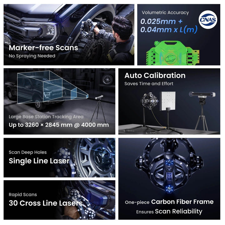De Revopoint Trackit is een hoogprecieze, markerloze 3D-scanner die optische tracking combineert met blauwe lasertechnologie. Dankzij automatische gimbalkalibratie, dubbele scanmodi en een groot trackingbereik maakt hij professionele metingen mogelijk van kleine onderdelen tot complete voertuigen.