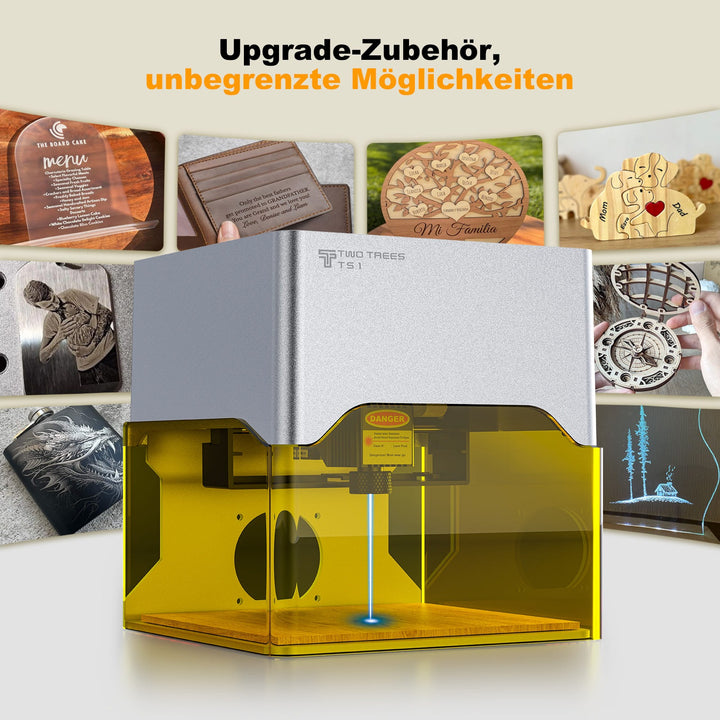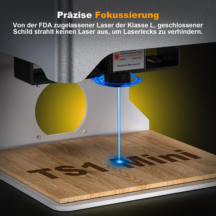 Met zijn 455 nm blauwe laser maakt de TS1 Mini haarscherpe gravures op diverse materialen zoals hout, leer, acryl, karton of gecoat metaal. Het werkgebied van 100 × 100 mm is perfect voor gepersonaliseerde unieke stukken, labels, hangers of kleine series met fijne details.