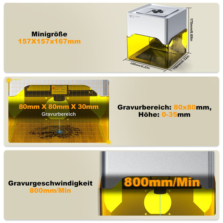 De TS1 Mini is een echt lichtgewicht. Met slechts 0,67 kg is hij gemakkelijk te vervoeren, op te bergen of direct mee te nemen – ideaal voor mobiele creatieve workshops, pop-up stores of flexibel gebruik thuis en in de studio. De robuuste aluminium behuizing zorgt voor stabiliteit en precisie tijdens het graveren.